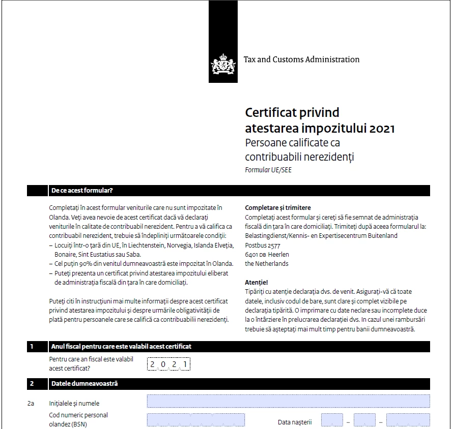 Acest formular documentează veniturile dumneavoastră românești, respectiv veniturile din afara Olandei concret pentru acel an fiscal. Chiar și atunci când, de exemplu, în cursul anului nu ați avut niciun venit în România sau în orice altă țară în afara Olandei.